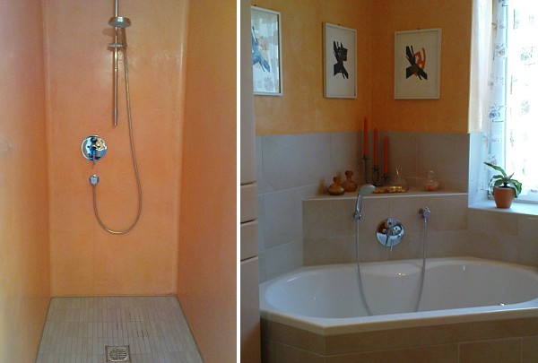 Umbau Reihenhaus in 67346 Speyer, Dusche nach Umbau, in Marmorspachteltechnik